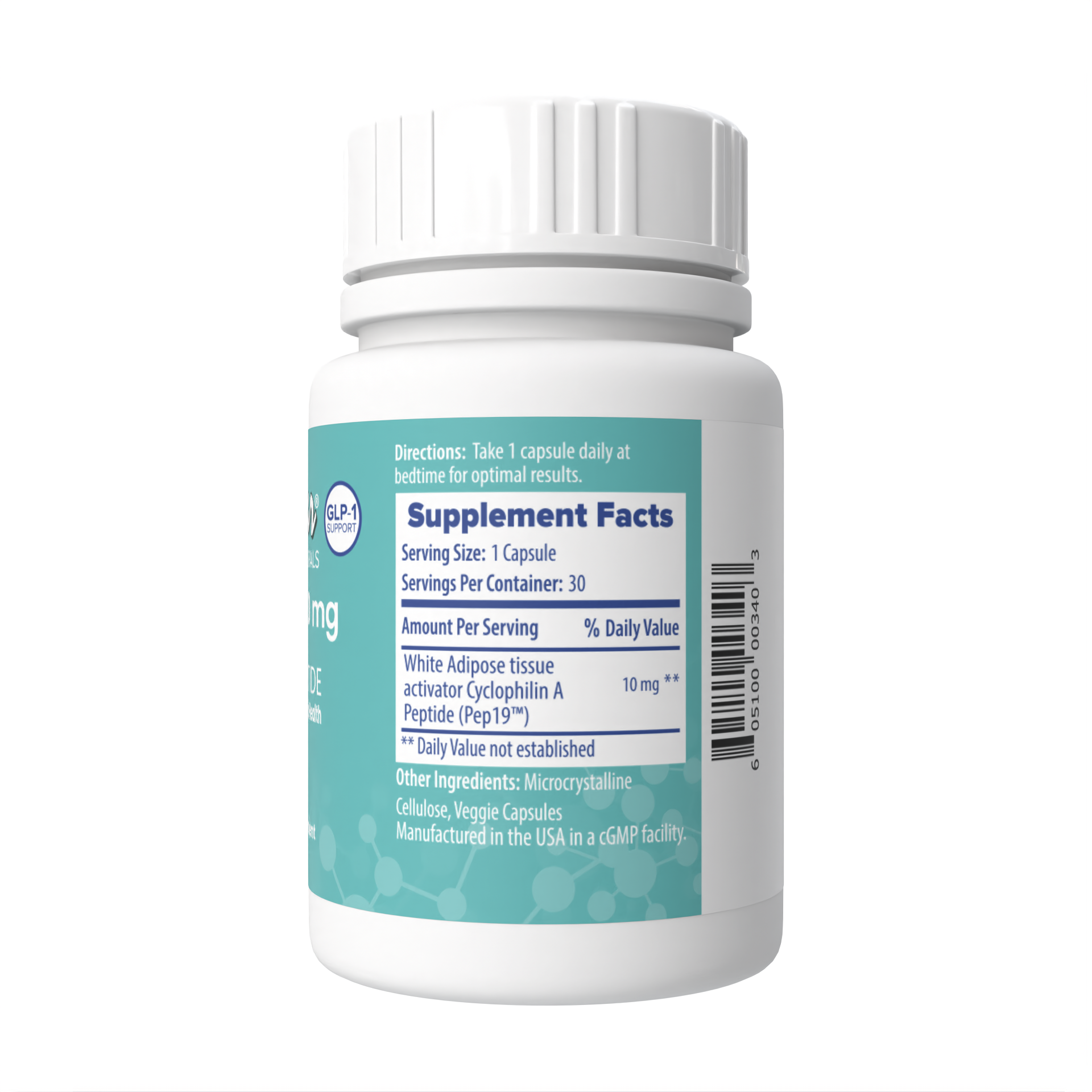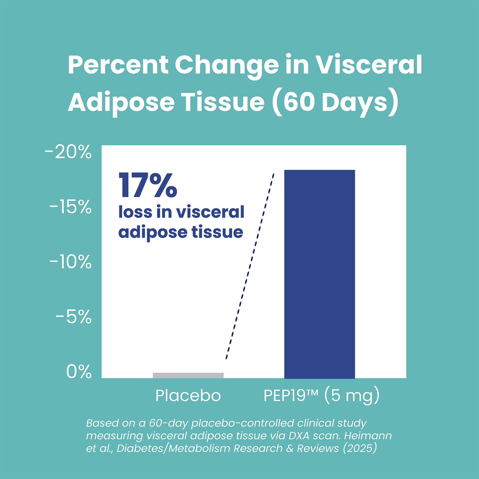 PEP19™ is a bioactive peptide that helps support your body’s natural metabolism and energy balance. It may help promote a healthier body composition by supporting how your body stores and uses energy.